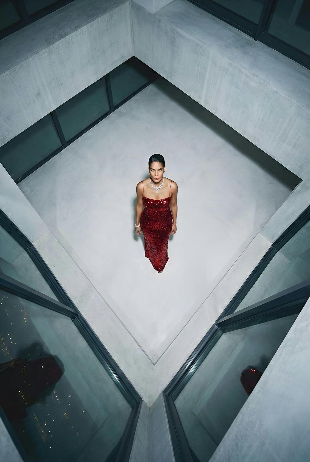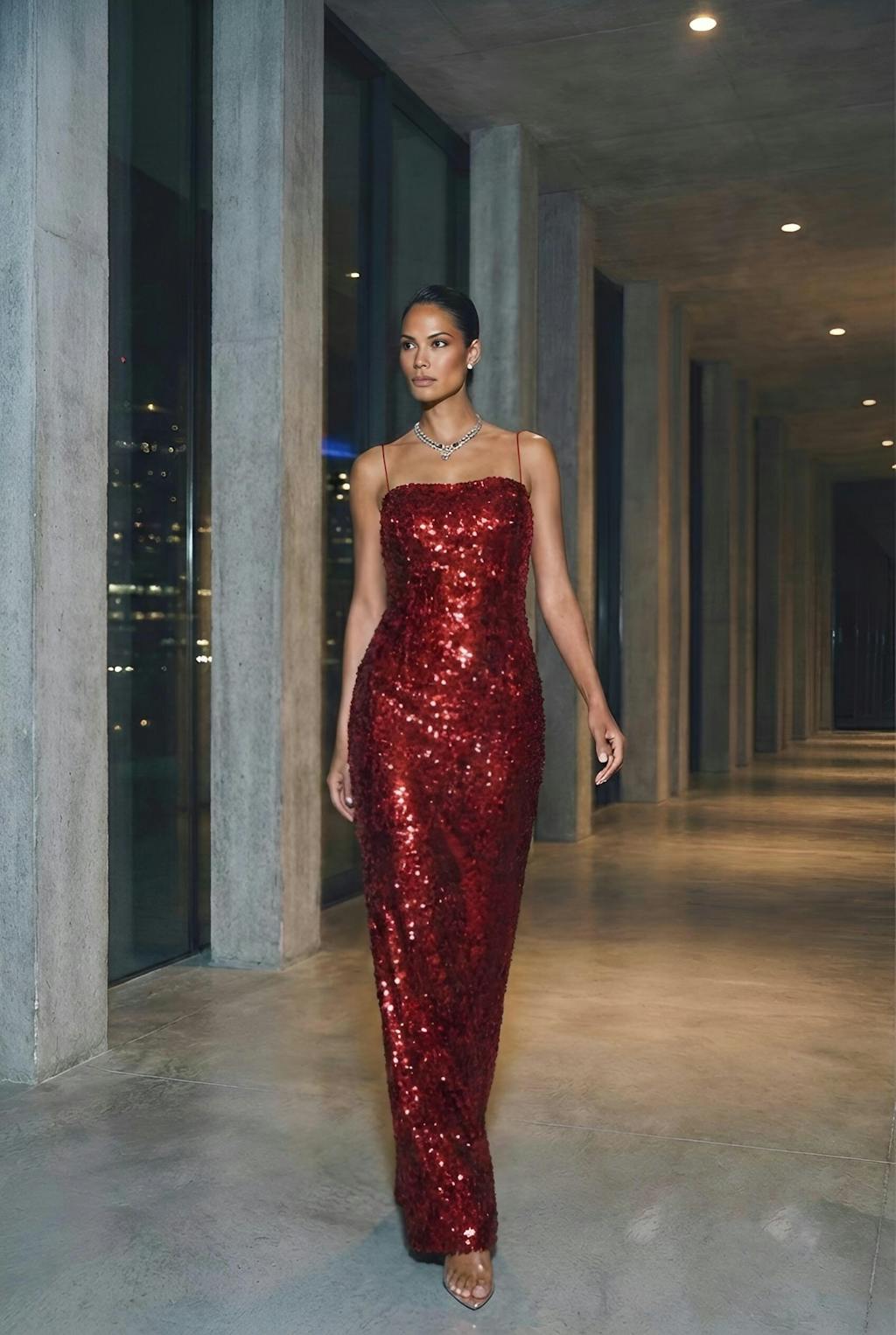 The Afterlight Gown is designed to linger. Cut in a sleek, body-skimming silhouette and finished with luminous sequins, Minimal straps and a clean neckline allow the garment to speak for itself, embodying confidence that doesn’t need permission.