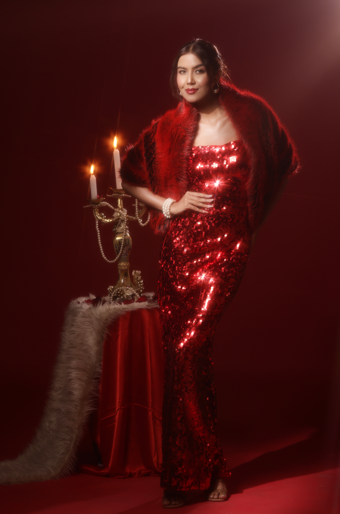 The Flame Stole is heat made tactile. Plush and enveloping, it ignites the look with quiet intensity—designed to frame the shoulders and command the room. Styled with sequins, pearls, and candlelight, it embodies the VYNE woman at her most composed and dangerous.